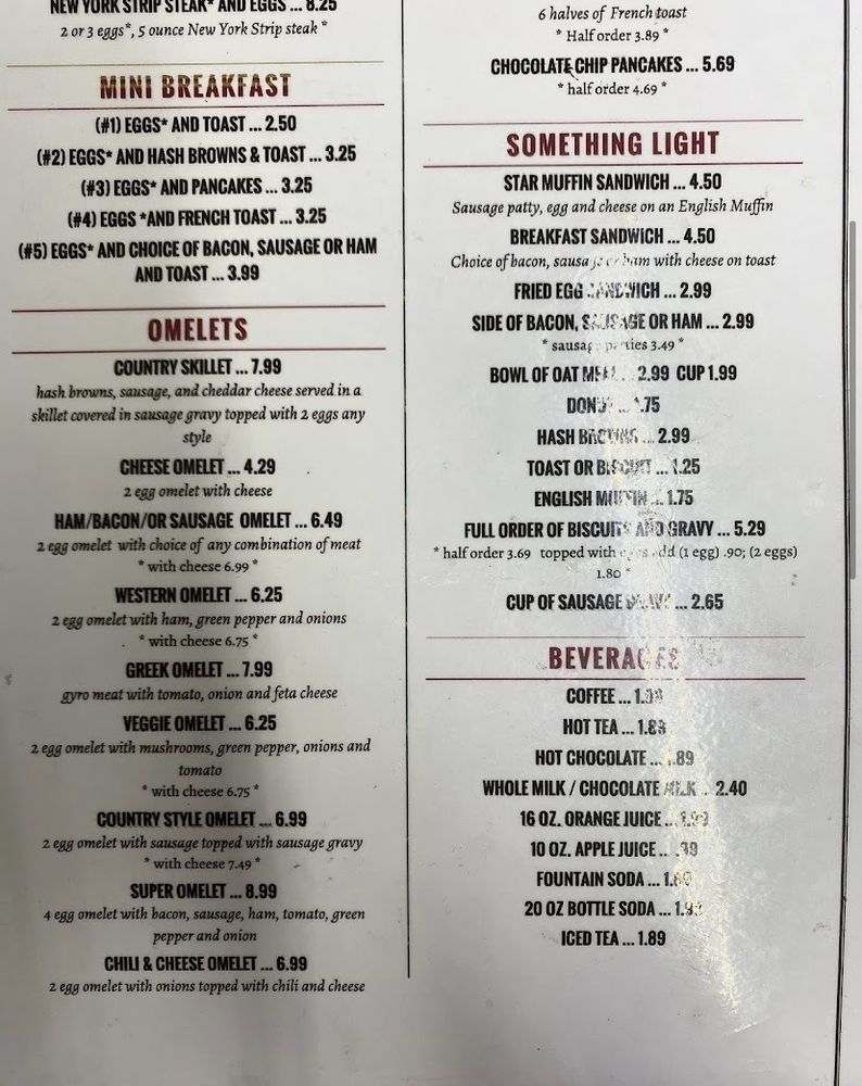 Start your day right with the hearty Biscuits and Gravy, a tantalizing treat that features biscuits halved and enveloped in rich sausage gravy, all for the affordable price of $6.29. Or try the Country Style Omelet, a two-egg masterpiece smothered in the same savory gravy, accompanied by crispy hash browns and toast, priced at just $9.99. Customer favorites, like the fluffy French Toast Breakfast and the wholesome Morning Star Breakfast Special, ensure that there is something for every breakfast lover.